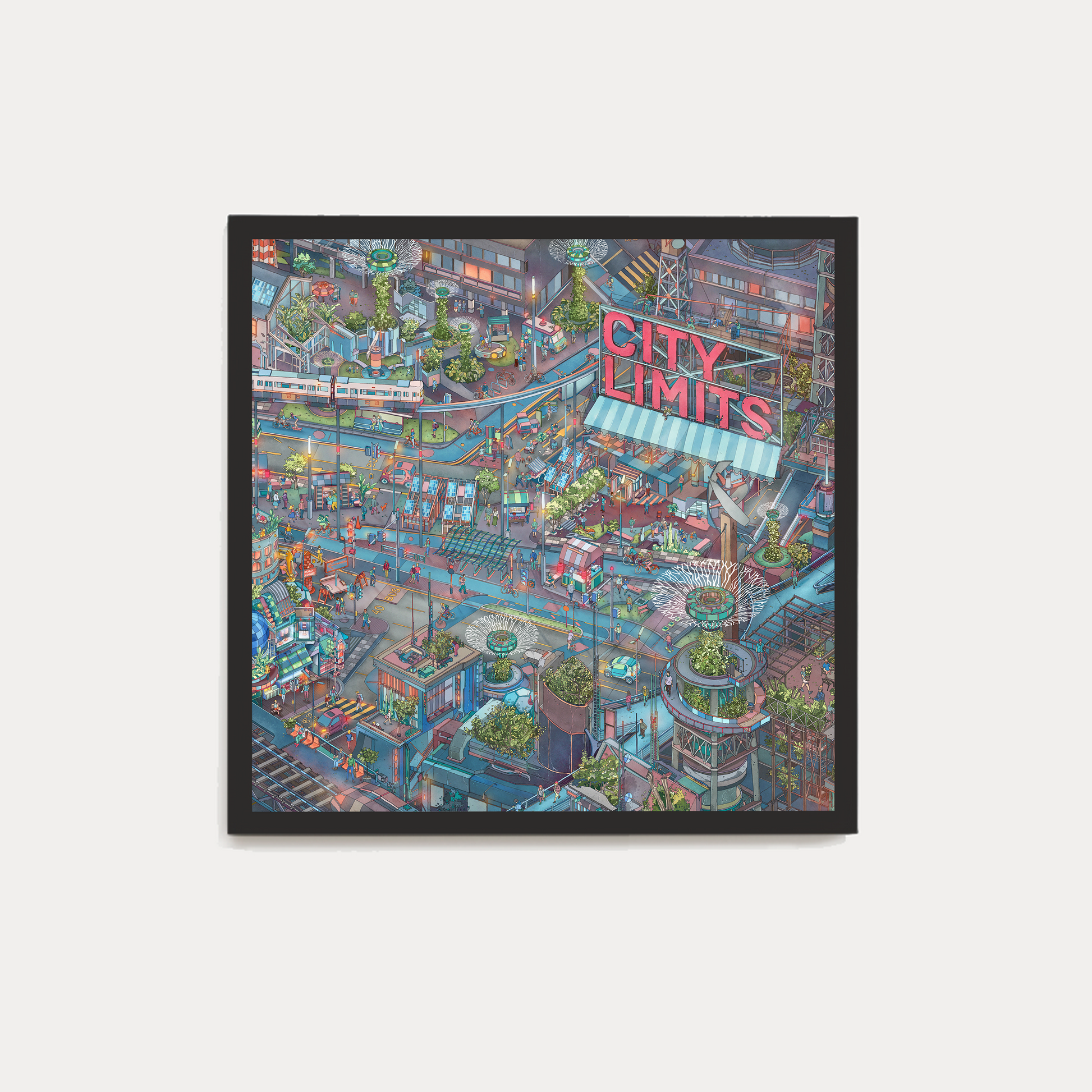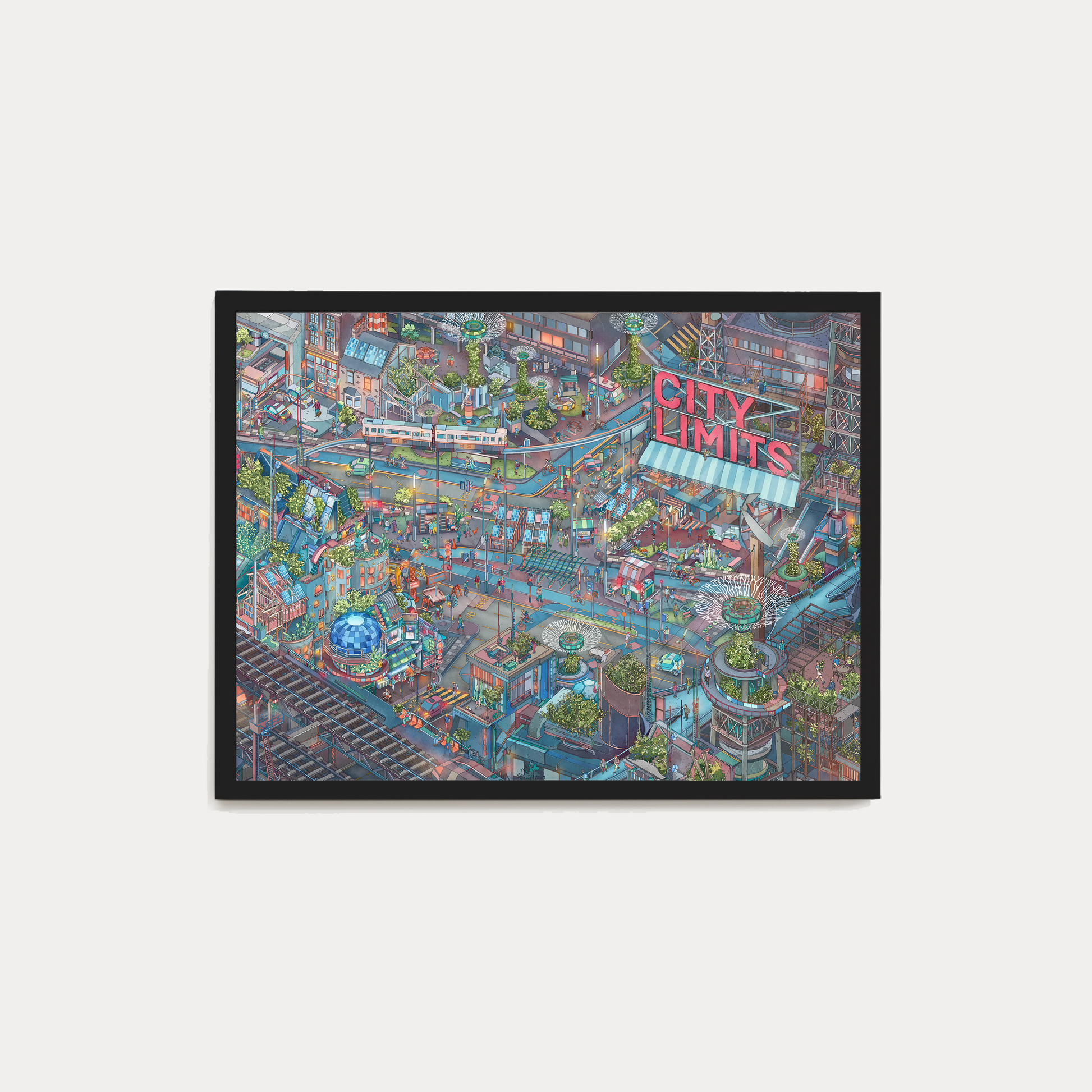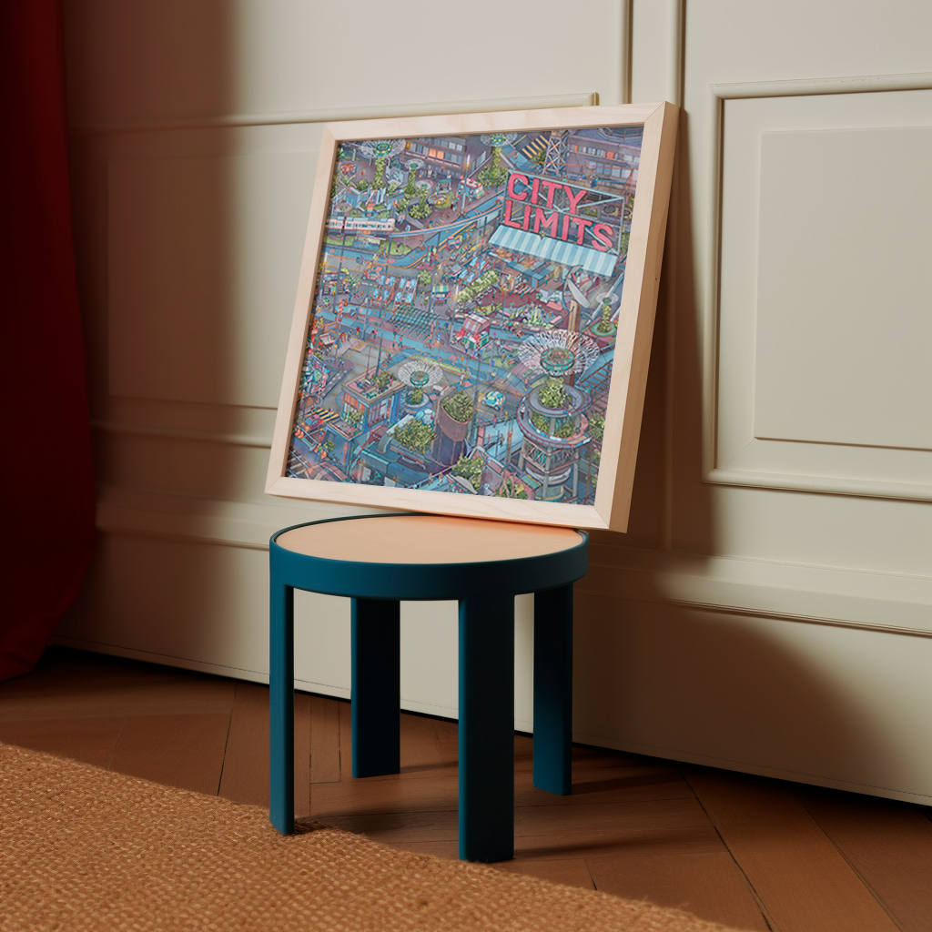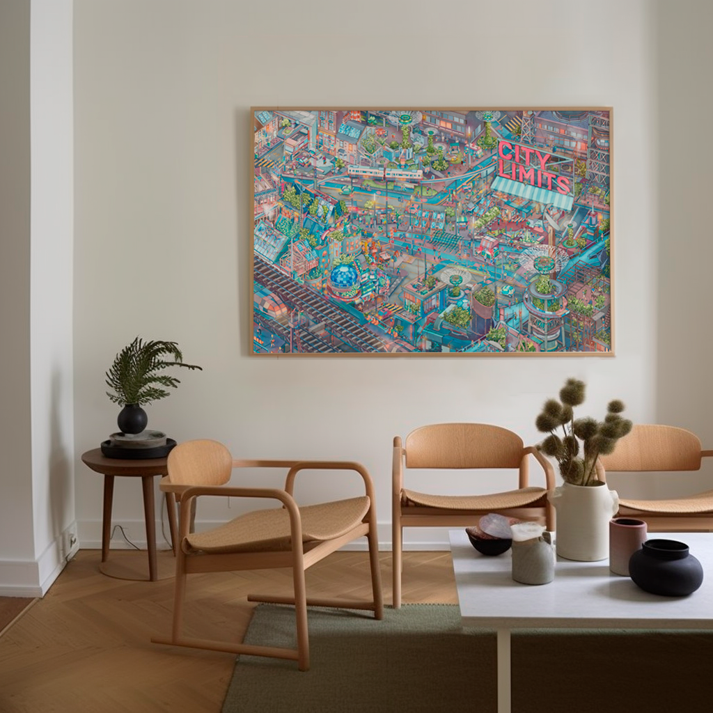 In a world where urban chaos meets ecological resilience, City Limits reimagines the future of city life as a vibrant, layered ecosystem. It intricately captures a fictional yet familiar metropolis, one where street markets, rooftop farms, autonomous transport, and vertical gardens coexist in joyful contradiction. The work explores how cities can be playful, dense, and green all at once, pushing the boundaries of what urban living could be. Blurring the lines between infrastructure and community, nature and technology, it invites viewers to get lost in a city where possibility sprouts from every corner.